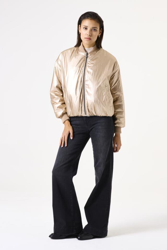 Chaqueta bomber reversible de suave piel sintética y acabado brillante. Presenta cuello redondo, mangas largas y cierre de cremallera, lo que proporciona un ajuste cómodo y holgado. El interior brillante está hecho de material repelente al agua. La capa exterior es 100 % poliéster.