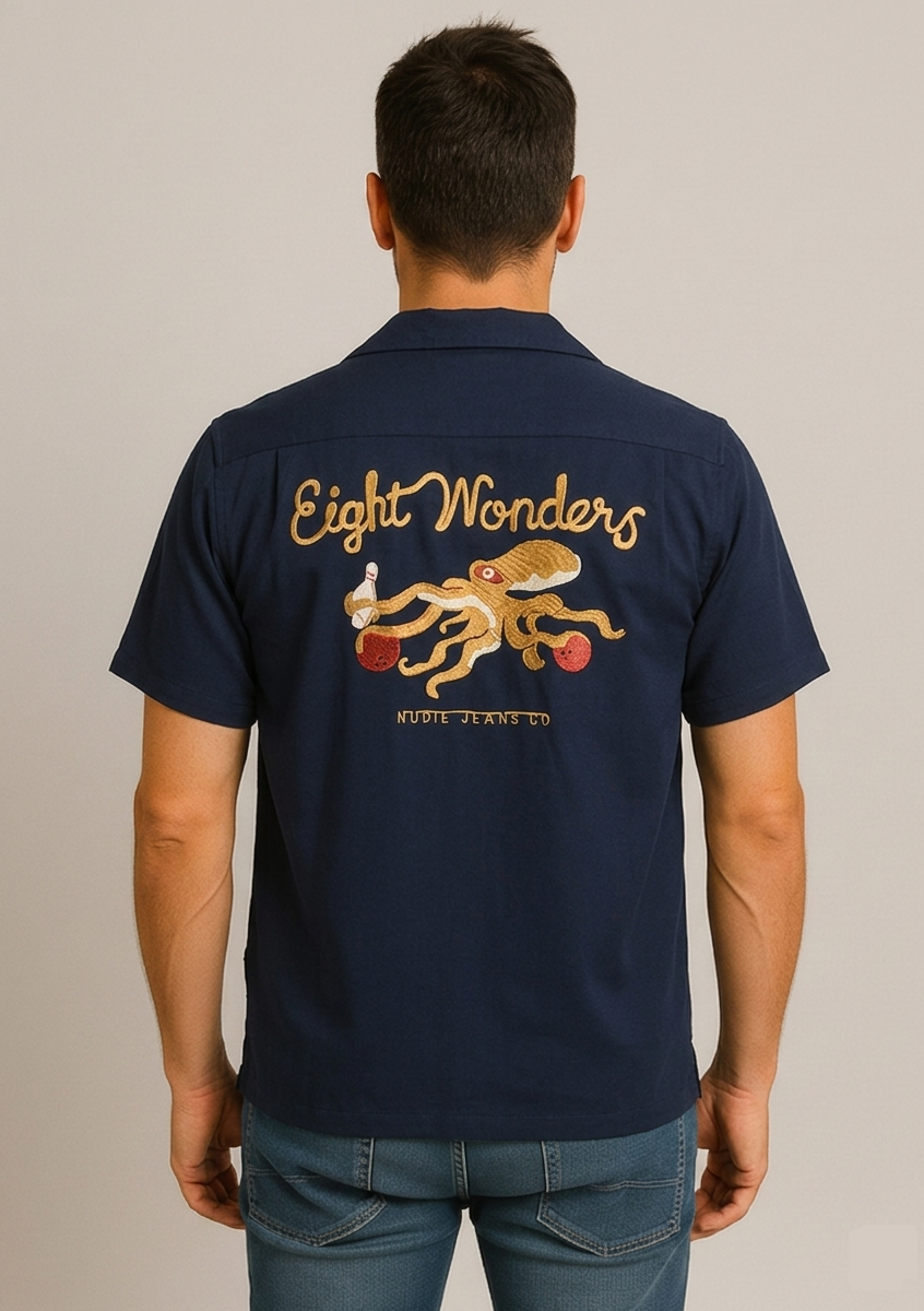 En la parte frontal, luce un discreto bordado dorado con el nombre de la marca sobre el bolsillo. Sin embargo, el verdadero protagonista es el espectacular diseño trasero: un detallado bordado de un pulpo jugando a los bolos bajo el lema «Eight Wonders». Esta Camisa Arthur Bowling Nudie Jeans combina a la perfección la herencia artesanal de Nudie Jeans con un espíritu creativo y audaz.