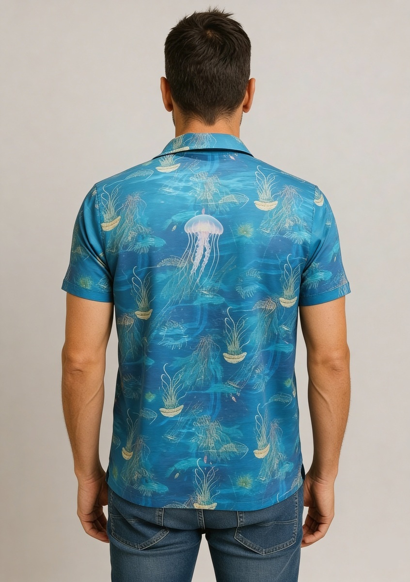 Vibrante Camisa Arvid Hawaii Nudie Jeans, una prenda que captura la esencia del verano con el sello distintivo de Nudie Jeans. Esta pieza destaca por su cautivador estampado integral de inspiración oceánica, donde elegantes medusas flotan sobre un fondo azul profundo.