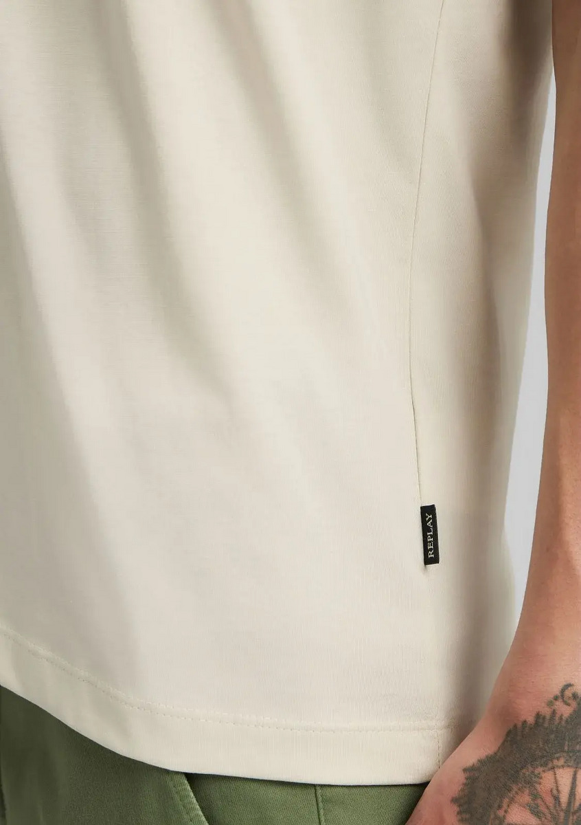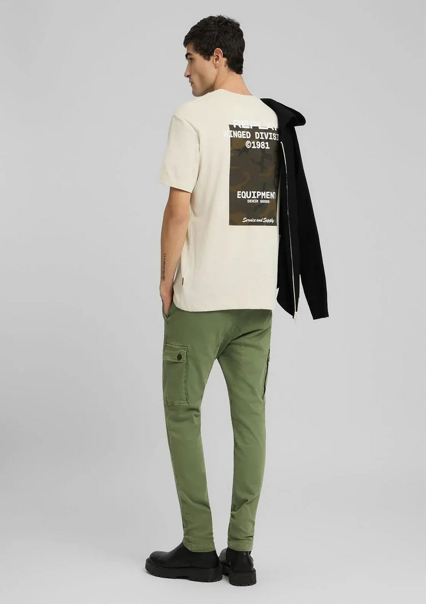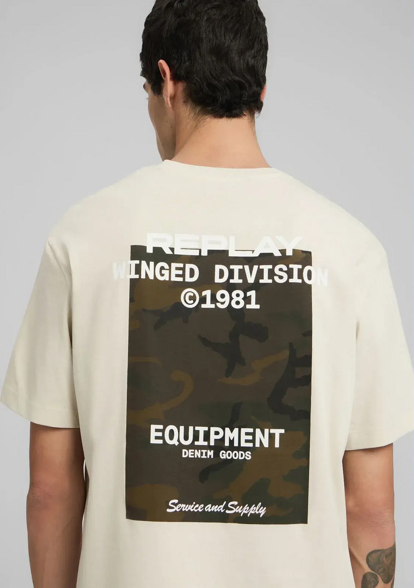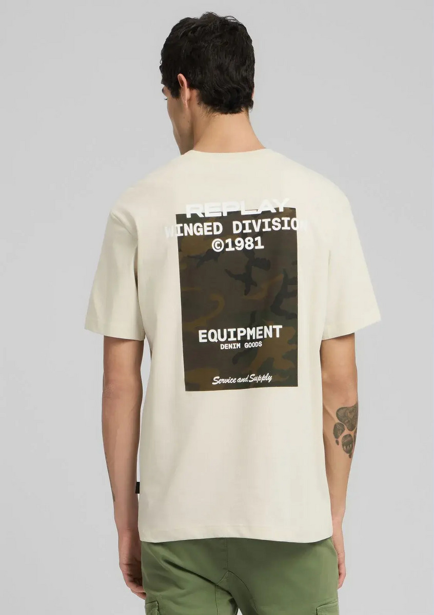 Camiseta relaxed fit de cuello redondo confeccionada en punto de algodón puro, garantía de suavidad y durabilidad. Esta camiseta demanga corta para hombre tiene un bolsillito en el pecho y un gran estampado con inscripción personalizada y motivo de camuflaje en la espalda.