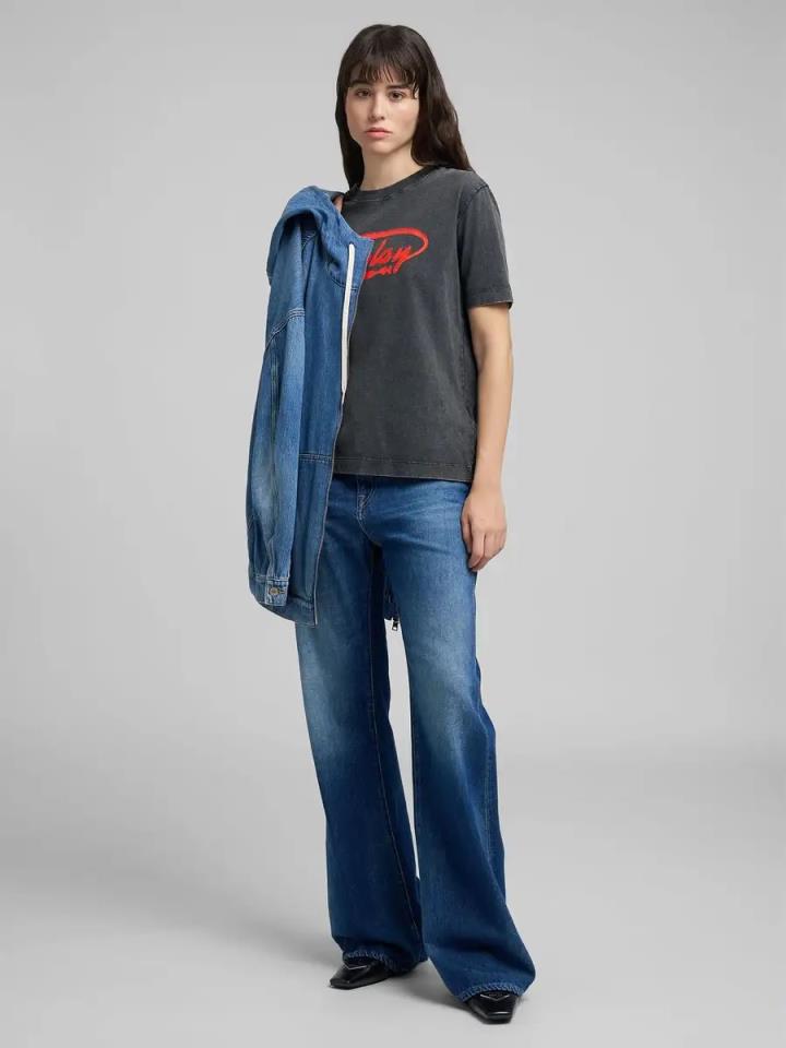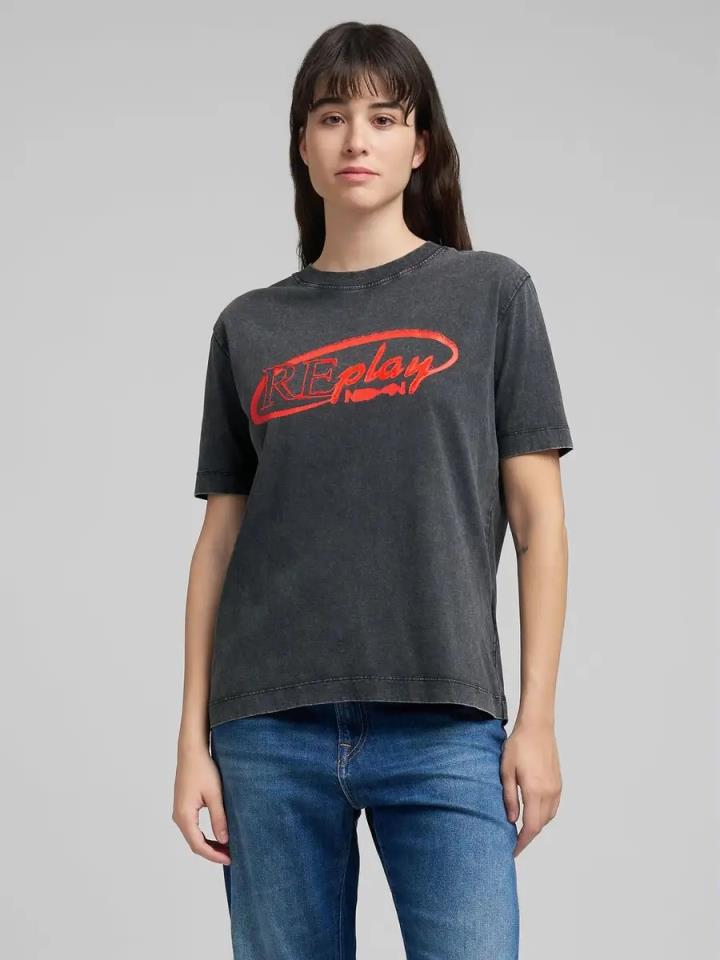 Camiseta de cuello redondo confeccionada en punto de puro algodón ligero con tintura de efecto jaspeado. La camiseta de manga corta con hombro ligeramente caído está adornada con un gran estampado gráfico en contraste en el pecho