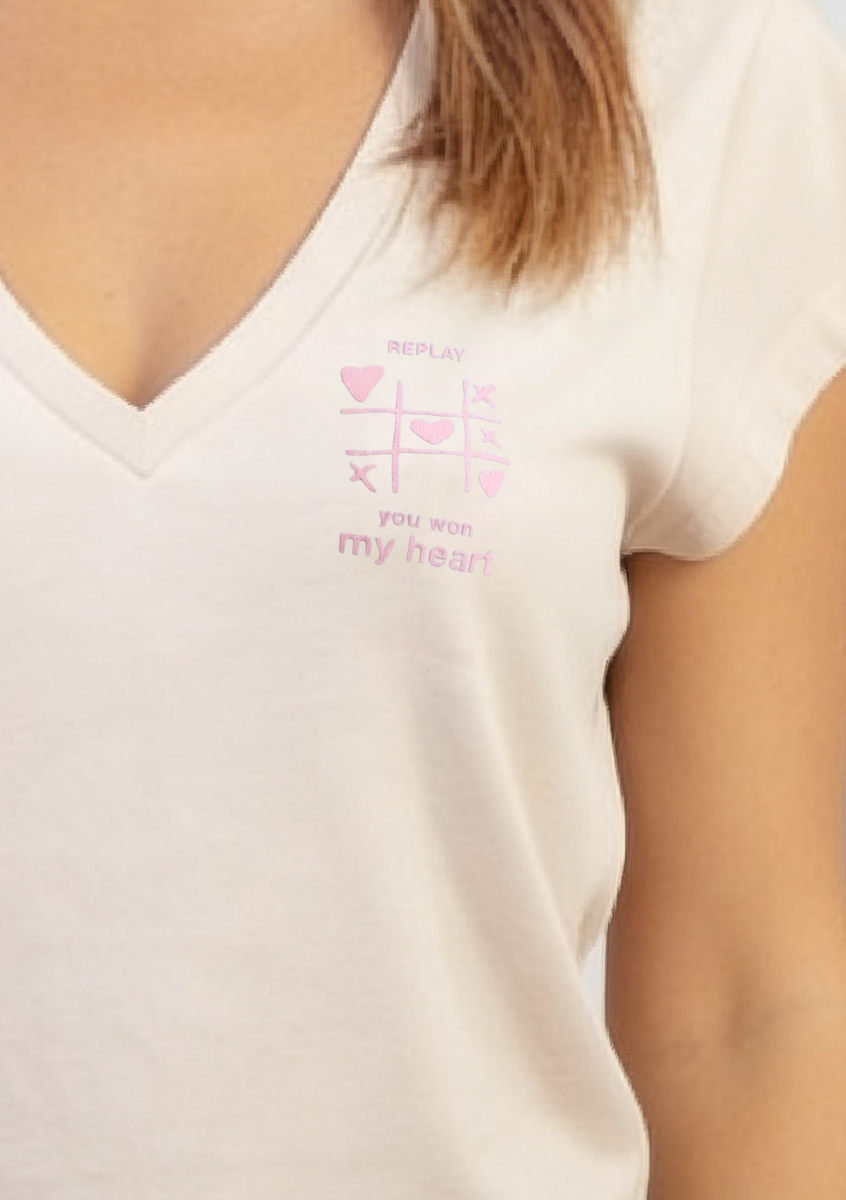Exclusiva Camiseta pico My Heart Replay. Confeccionada en algodón beige crema de alta calidad, esta prenda destaca por su favorecedor cuello en pico y mangas cortas, ofreciendo un ajuste cómodo y relajado para el día a día. El detalle clave es el encantador gráfico rosa en el pecho izquierdo, que presenta un diseño de tres en raya (Tic-Tac-Toe) con delicados corazones y el conmovedor mensaje «you win my heart». Esta camiseta es un verdadero reflejo del estilo casual y la atención al detalle que caracteriza a Replay, fusionando un diseño original con una calidad excepcional. Perfecta para combinar con jeans y crear un look effortless chic que exprese tu personalidad.