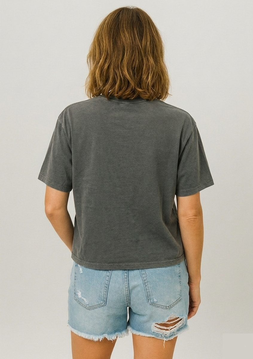La Camiseta Rita Ballena Nudie Jeans, una prenda esencial de algodón orgánico suave en un tono gris carbón lavado con efecto vintage. Confeccionada con un corte relajado y cómodo, esta pieza de Nudie Jeans presenta un ingenioso gráfico frontal en tinta blanca que muestra una ballena emergiendo del agua con un carrito de compras, acompañado de la frase irónica «THANK YOU FOR SHOPPING».