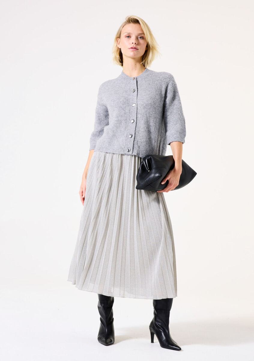 Cárdigan elegante con cierre de botones. Este cárdigan presenta cuello redondo, mangas tres cuartos y un corte holgado. Está confeccionado con una mezcla de alta calidad de 45 % poliamida, 19 % alpaca, 19 % lana, 14 % acrílico y 3 % elastano, que proporciona una experiencia cálida y cómoda. El tejido de canalé le da un toque moderno, ideal para cualquier ocasión.