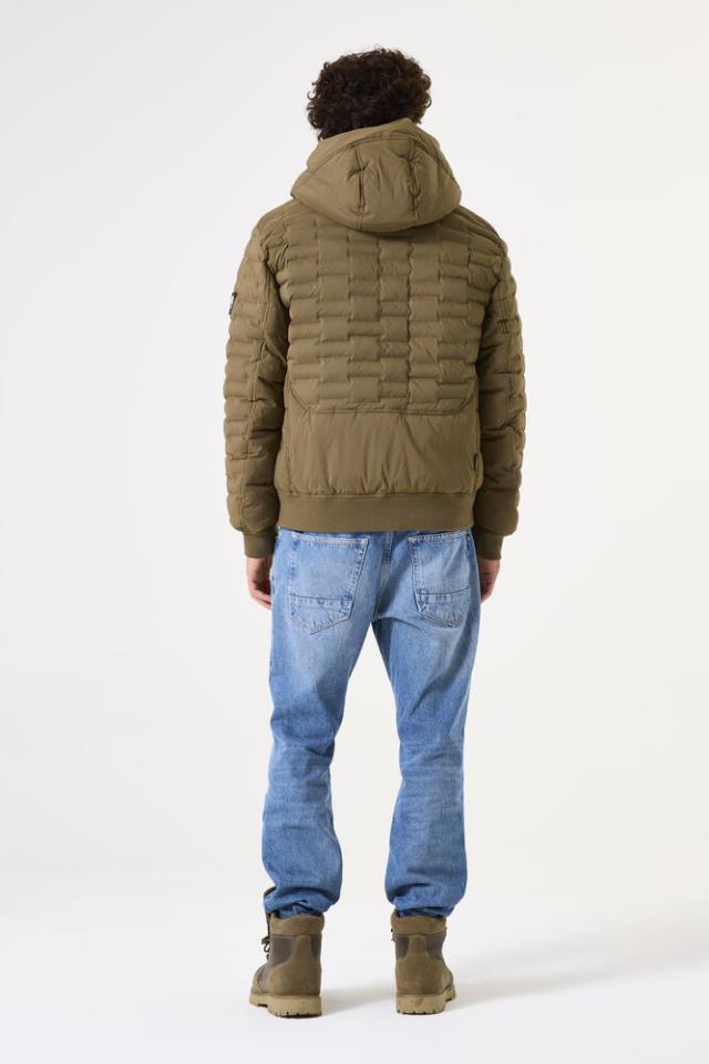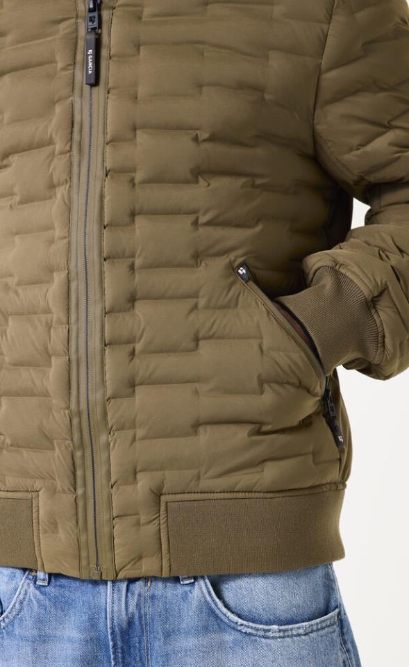 Chaqueta acolchada ligera con estampado guateado. Esta chaqueta acolchada está confeccionada con material repelente al agua y forrada con un suave relleno de plumón sintético para mayor comodidad y calidez. Además, cuenta con cuello alto con capucha, mangas largas, cremallera revestida de goma, bolsillos laterales con cremallera y corte regular. La capa exterior está hecha de 90 % poliéster y 10 % elastano.