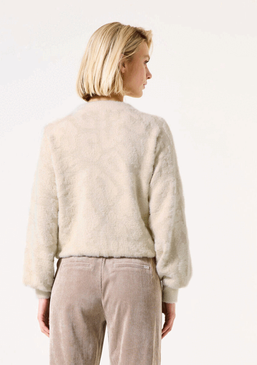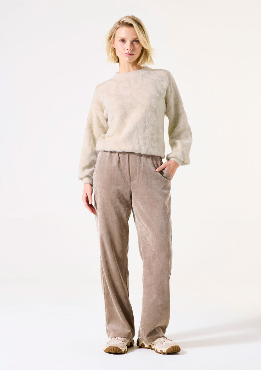 Suéter con un moderno estampado de leopardo. Este suéter tiene cuello redondo, mangas largas y corte clásico. Está confeccionado con un 70 % de poliamida, un 14 % de viscosa, un 13 % de poliéster y un 3 % de hilo metálico.