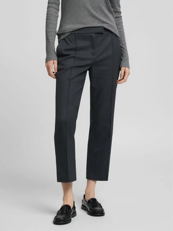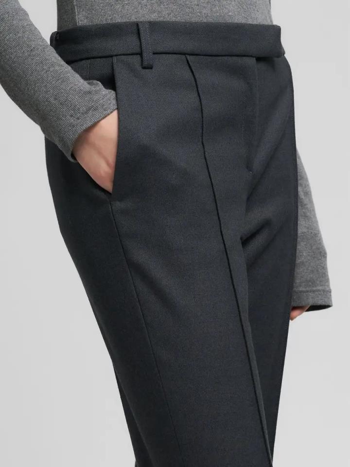 Pantalones cropped de corte slim confeccionados en suave sarga de mezcla de viscosa elástica teñida en hilo. La prenda presenta un refinado pliegue planchado en la parte delantera y trasera, dos bolsillos franceses y dos elegantes bolsillos traseros ribeteados, uno de ellos acabado con el icónico remache R. Este pantalón de mujer se completa con un cierre frontal oculto descentrado.