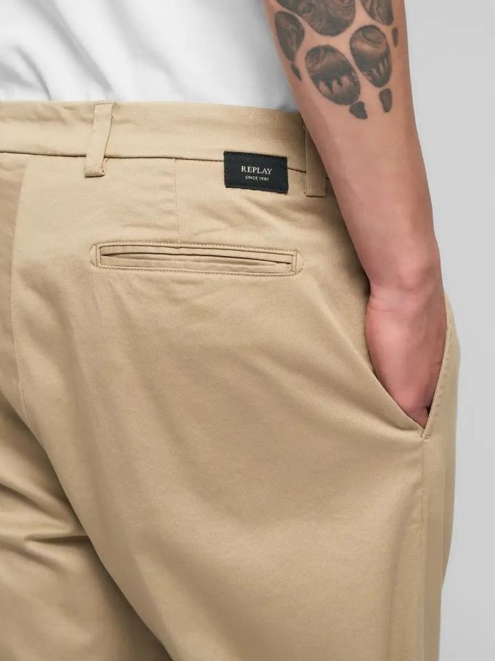 Pantalones de corte regular confeccionados en suave y duradera sarga de algodón elástico. El modelo presenta dos cómodos bolsillos franceses, dos refinados bolsillos traseros de ribete, trabillas para el cinturón y está acabado en la parte posterior con la icónica etiqueta Replay. Una prenda de diseño sobrio y versátil, destinada a convertirse en un auténtico imprescindible del armario masculino.